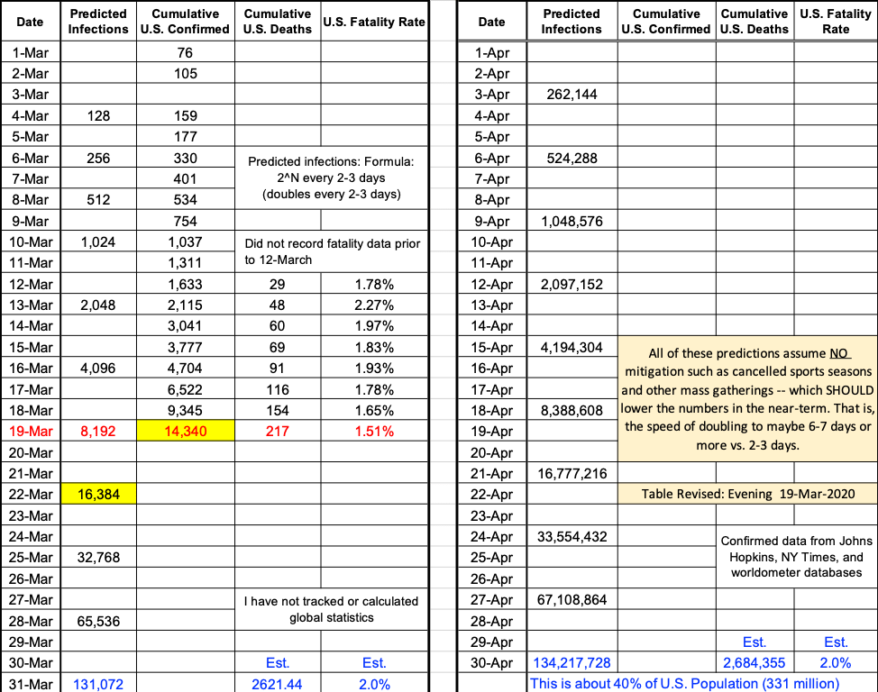As for today’s data, things are looking glum. In the table below we see that as of Thursday evening 19-March we are “ahead of schedule” by almost two days (yellow boxes). As discussed in previous posts this larger-than-expected increase is in all likelihood caused by increased testing. More tests = more confirmed cases. The good news — also expected — is the corresponding decrease in estimated fatality rate. Will keep you updated.