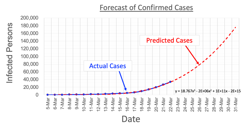 If you look closely at the table you will see that the predicted number of cases has been modified starting 21-March. As we expected, increased testing results and mitigation measures are beginning to undermine the simple “double-every-3-days” formula, affecting its ability to accurately predict the number of cases going forward. So now what do we do?