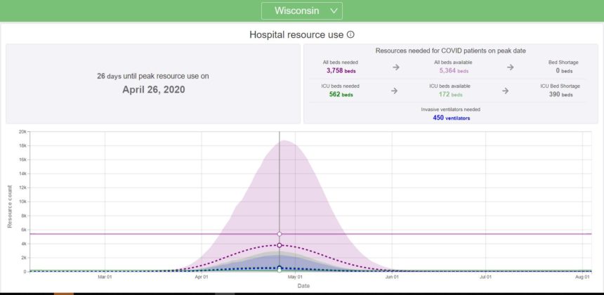 The University of Washington’s Institute for Health Metrics & Evaluation (IHME) released an interactive projection for every state. That analysis found Wisconsin’s peak resource use will come in 53 days, on May 22, as of Sunday. On Monday, the data changed, indicating the state would peak in 26 days, on April 26. There could be a shortage of 360 ICU beds, but not overall hospital bed space, according to the prediction.
