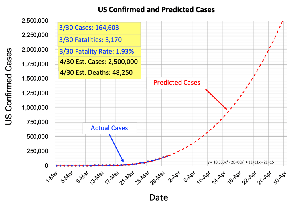 Notice that we have extended the time axis to the end of April. The number of confirmed U.S. cases currently exceeds 164,000. Trends based on my simplified model continue on track to reach ~200,000 cases by the end of March, ~650,000 by Easter, and ~2,500,000 by the end of April. Current estimated fatality rate is about 1.93% corresponding to over 48,000 deaths by April 30. Gloom, I know. The red curve shows some truly frightening numbers. It appears that we are moving beyond gloom & doom and into Stephen King territory.