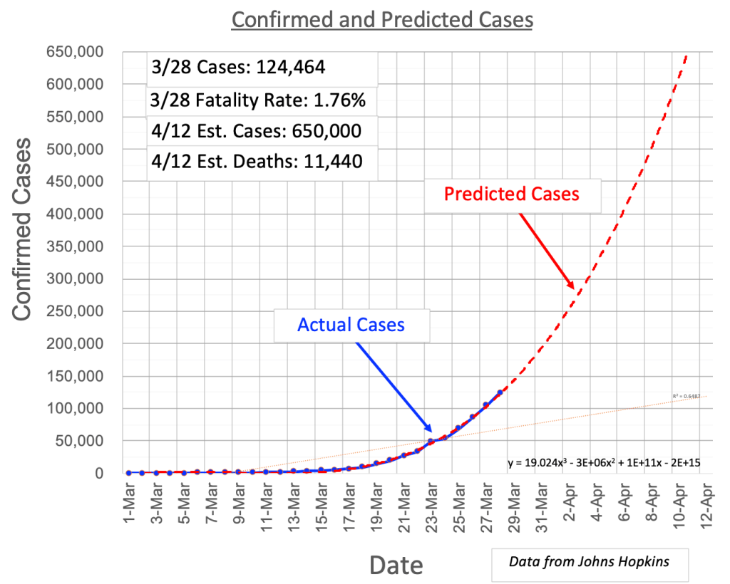 Today the number of confirmed U.S. cases exceeds 124,000. Trends appear to be on track to reach ~ 200,000 cases by the end of March, with ~ 650,000 by Easter. Estimated fatality rate is about 1.76%, corresponding to over 11,000 deaths by Easter.