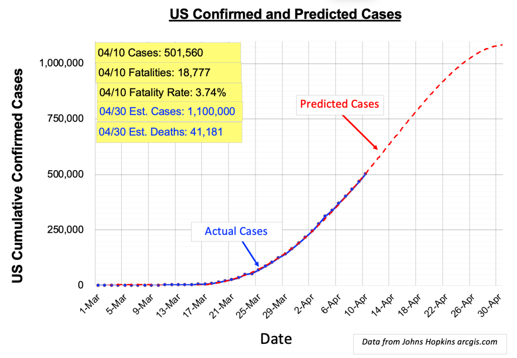 The number of confirmed U.S. cases currently exceeds 500,000. Trends based on 3rd order trend line continue on track to reach ~600,000 by Easter, and ~1,100,000 by the end of April. The curve fit shows some bending toward the end of April. This is good. Current estimated fatality rate is about 3.74%, corresponding to over 40,000 deaths by April 30. The fatality rate has been increasing every week. This is unexpected since we thought additional testing would increase the denominator. Reason is unclear at this time. As usual we need more data.
